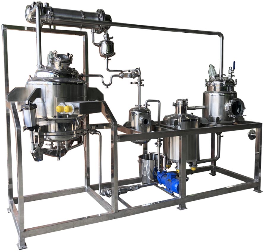 將藥材投入提取罐內(nèi),加藥材的5~10倍的溶媒如水、乙醇、甲醇、丙酮等(據(jù)工藝要求)。開(kāi)啟提取罐直通和夾套蒸汽閥門(mén),使提取液加熱
